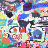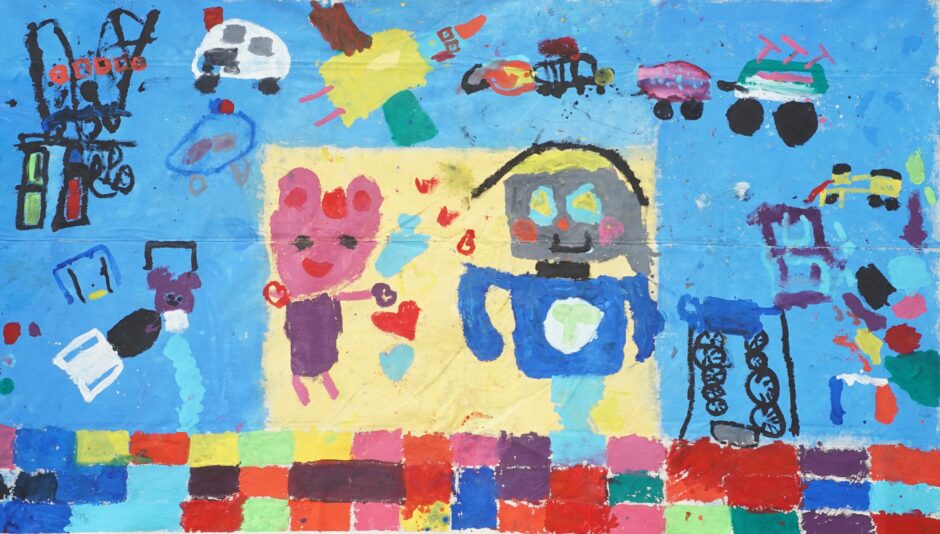 ホームお知らせ 巨大絵画アーケード展3「みんなとつなごう みらいのまち」高槻双葉幼稚園 2025年9月29日 空飛ぶ乗り物、昆虫やお菓子でできた遊具、虹、ロボットなどアイデアたくさん!ワクワクする街が素敵だね!
