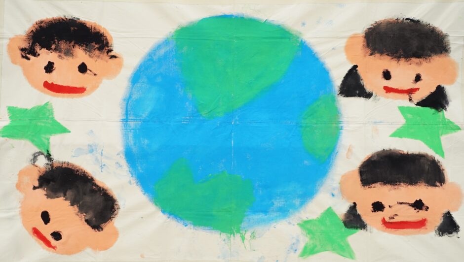 未来の世界でも子どもたちの笑顔が溢れているようにと地球と子どもたちの笑顔を描きました。