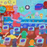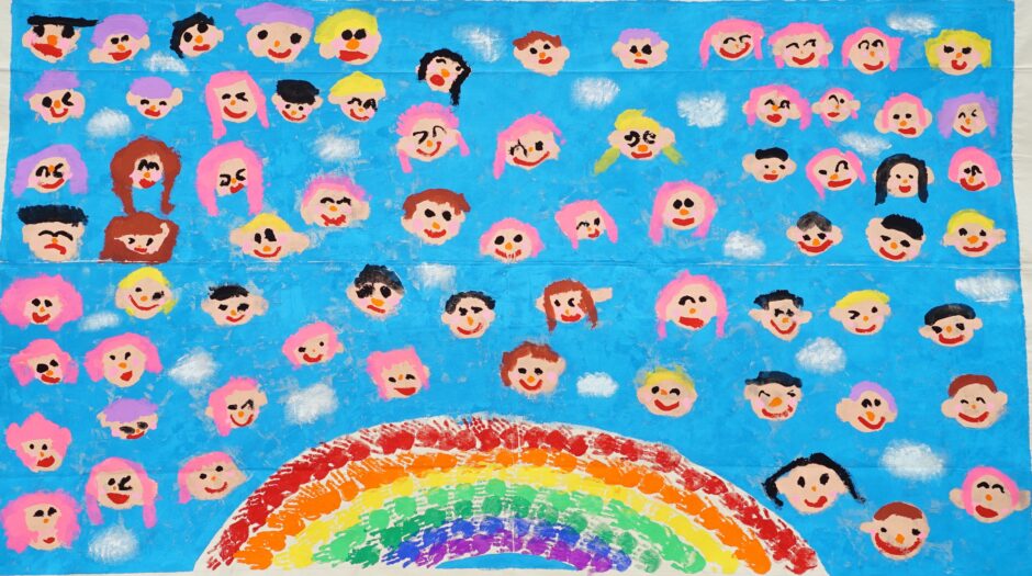 ホームお知らせ 巨大絵画アーケード展7「おおきくなったわたしたち♪」白ばら幼稚園 4歳児 2025年9月29日 未来の自分を想像しながら、一人一人顔を描きました。希望溢れる明るい未来を手型の虹で表現しました。
