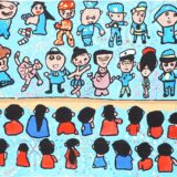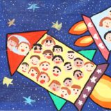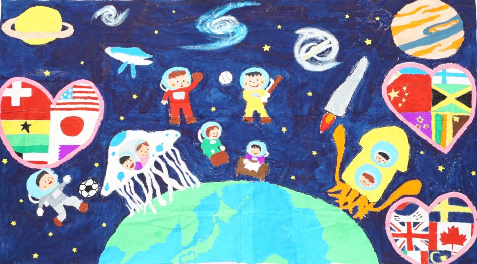 子どもたちが宇宙で勉強したり遊んだりスポーツをしたりみんな仲良く生活ができどこの国も平和で仲良く過ごせますように願いを込めました。